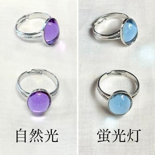 ガラスに酸化ネオジウムを混ぜることで作られていますが(鉱石のアレキサンドライトを含んでいるわけではありません)、このカラーチェンジは酸化ネオジウムが黄色の光を吸収する性質を持っているため起こります。