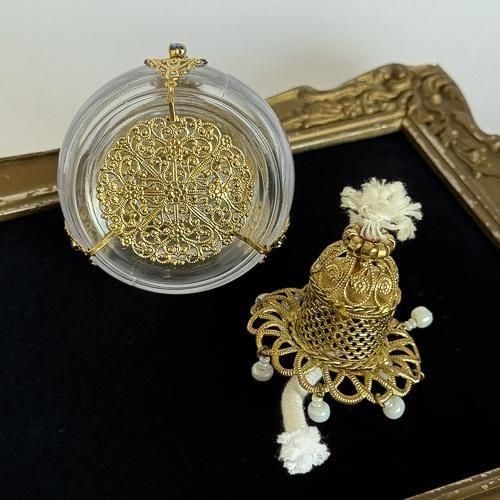 真鍮の装飾は、プレス機で形作られた複数のパーツを溶接し組み立て、ひとつひとつガラスストーンをはめ込んで作られています。