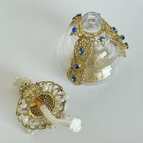 プレスガラスの本体に真鍮とガラスストーンで装飾が施されています。