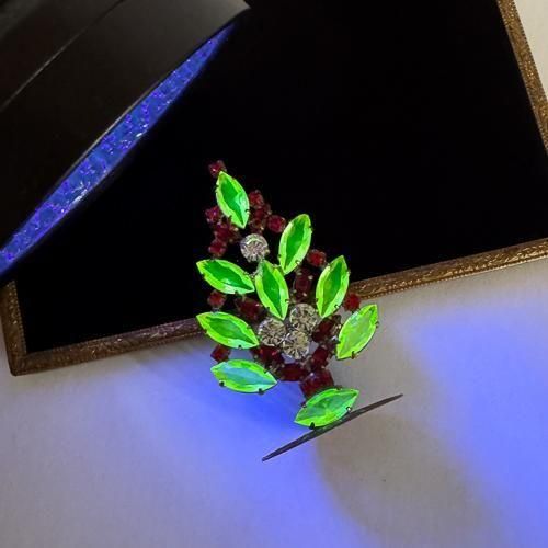 自然光では薄いシトリンのような色のガラスは、ウランガラスでできていますのでUVライトを当てると蛍光黄緑色に発色します。