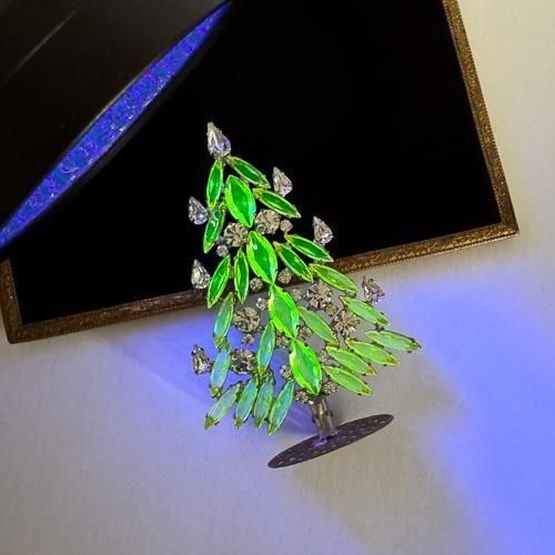 自然光では薄いシトリンのような色のガラスは、ウランガラスでできていますのでUVライトを当てると蛍光黄緑色に発色します。