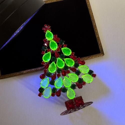 自然光では薄いシトリンのような色のガラスは、ウランガラスでできていますのでUVライトを当てると蛍光黄緑色に発色します。